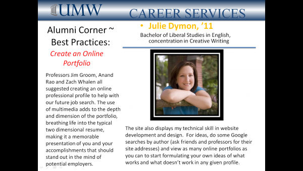 My online professional portfolio, www.juliedymon.com, was featured in a Technology in the Job Search Spotlight presented by the University of Mary Washington’s Career Services department. Sarah Monroe, Associate Director for Internships, created this PowerPoint presentation combining my answers to her interview questions and screen shots from my online profile site. These slides were displayed on the Career Services digital sign on campus.